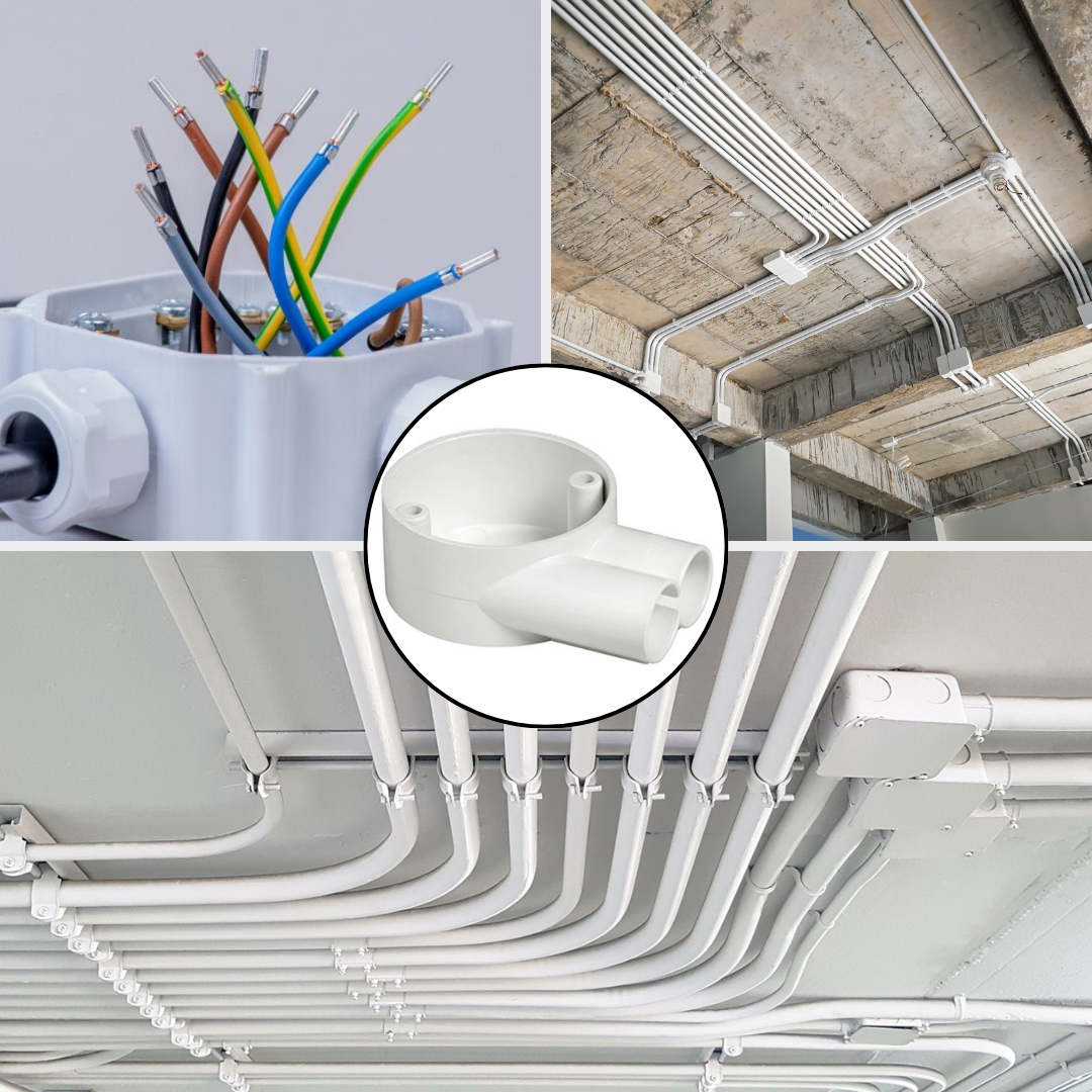 PVC fittings are used to connect sections of pipes or tubes, adapt to different sizes or shapes, and controlling the flow of water or used in electrical applications. They are a small part that connects or “couples” one part to another, usually permanently. Electrical junction boxes are simply standard electrical boxes that house and protect the connections of two or more circuit cables or wires. They are the communal meeting spot for electrical wires—where they connect before moving in different directions through conduit and other electrical fittings.